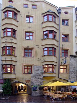 Nach unserem Einkauf wandern wir weiter durch den immer noch vom Himmel fallenden Nieselregen. Er stört uns aber nicht so sehr, da wir schnell zu den schützenden Bogengängen kommen. Hier kann Evi den gestern gekauften Schirm einklappen. Ich trete immer wieder einmal aus den Bogengängen hervor, um einige Bilder zu machen. Auch das "Goldene Dachl“ fotografiere ich bei Tageslicht.