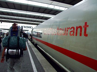 Dann steigen wir in den ICE und siehe da, auf einem unserer Plätze sitzt schon eine Frau. Aber sie räumt das Feld, als Evi auf unsere Reservierung hinweist. Und wie wir es geahnt haben, der Zug, der von München über Berlin nach Hamburg fährt, ist sehr voll. Da wir aber mit die ersten im Wagen waren, haben wir unsere Kraxen am Wagonende in der extra für große Gepäckstücke vorgesehenen Ablage unterbringen können. Zwischen den Sitzen wäre wenig Platz gewesen.
