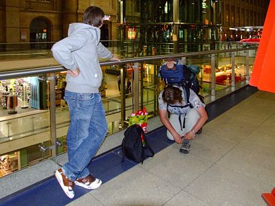 Als erstes suchen wir eine Toilette, im Untergeschoß werden wir auch fündig. Zuerst ist Evi dran, dann ich. Wir können ja schlecht mit den Kraxen auf die Toilette, also muss der eine die Rucksäcke bewachen, während der andere sich erleichtert. Während es bei den Männern nichts kostet, wird bei den Frauen fünfzig Cent verlangt. Die sind aber clever, eine gibt der anderen die Tür in die Hand, da ist es für alle preiswerter. Wir sind eigentlich Gegner von Toilettengebühren in öffentlichen Gebäuden wie dem Hauptbahnhof. Im Leipziger Hauptbahnhof kostet einmal Toilettenbenutzung mittlerweile einen Euro und zehn Cent!